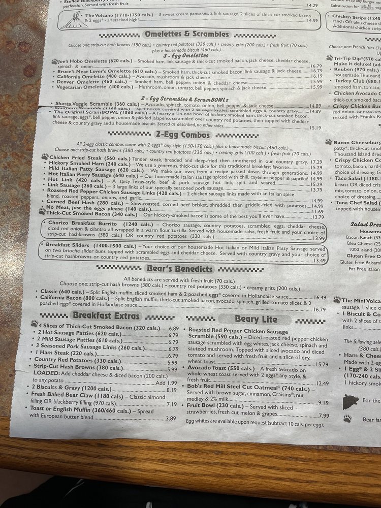 2 Chicken Sausage Links (400 cals.) Add $3.39, 2 Patty Sausage, we make our own mild (610 cals.) or hot Italian (620 cals.) Add $2.29, 2 Seasonal Pancakes (950-1350 cals.) Add $2.89, Stuffed Blackberry French Toast* (1240 cals.) Add $5.99, Cinnamon Roll French Toast* (1650 cals.) Add $2.99